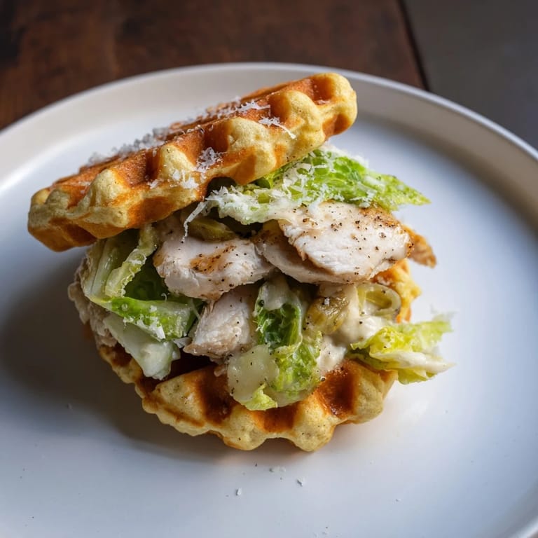 Save to Pinterest I was staring at leftover stuffing one Sunday morning, too sleepy to make pancakes, when I remembered my waffle iron gathering dust in the pantry. What started as a lazy experiment turned into something I now crave weekly: savory waffles that hold up like bread but taste like Thanksgiving. When I layered grilled chicken and Caesar salad between two of those crispy golden squares, I knew I'd stumbled onto something worth keeping.