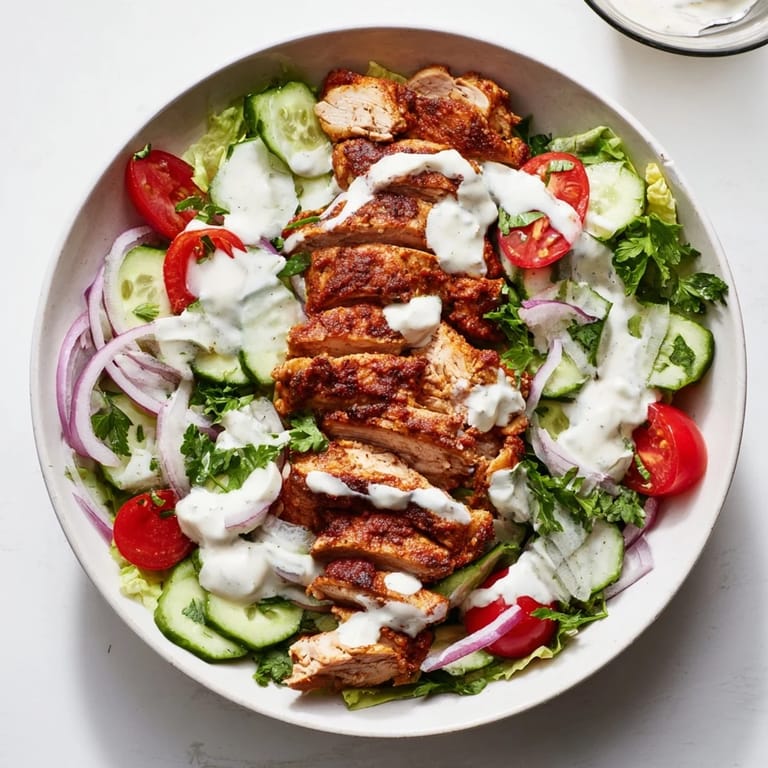 - Start with a bed of those crisp greens, then arrange tomatoes, cucumber, red onion, and parsley like you're presenting something special. Top with sliced chicken and finish with that garlic sauce.