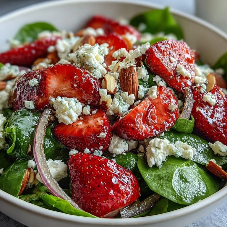 Save to Pinterest My neighbor knocked on the door one afternoon in June with a basket of strawberries so perfect they seemed almost unreal, and I suddenly had to figure out what to do with them before they got soft. The spinach was already wilting in my crisper drawer, so I started pulling things together—feta from the back of the fridge, almonds I'd been meaning to toast. What came together was this bright, almost effortless salad that somehow tasted like the exact moment summer decides to show up.