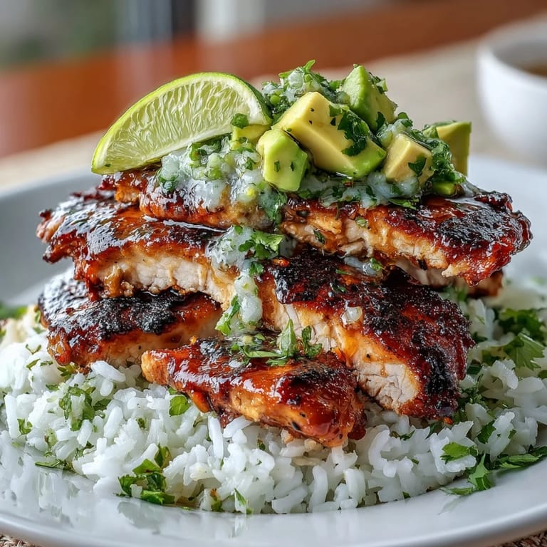 - On each plate, create a small bed of jasmine rice, arrange sliced chicken on top in an overlapping pattern, then spoon that vibrant avocado mix over everything. Finish with a lime wedge and serve immediately before anything gets cold.