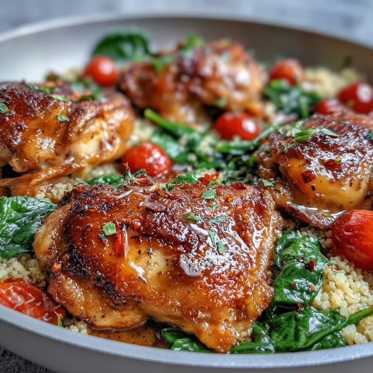 Save to Pinterest My roommate came home from work one evening to find our kitchen smelling like toasted garlic and butter, and she literally dropped her bag by the door asking what I was making. That's when I knew this one-pan garlic butter chicken couscous had something special going for it. It's the kind of dish that looks fancy enough to impress but honestly comes together faster than ordering takeout. The golden chicken thighs nestled into pillowy couscous with bright tomatoes and wilted spinach just feels like a warm hug on a plate.