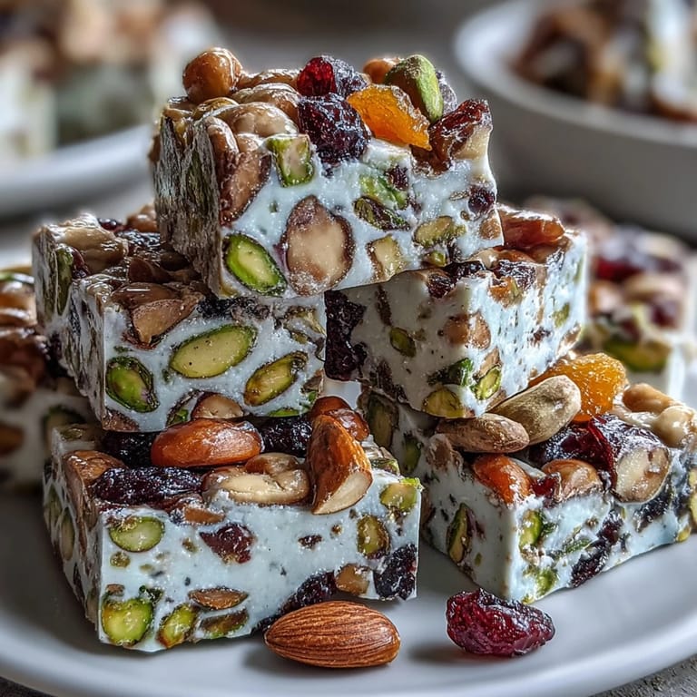 Nougat has been made for centuries in Italy, France, and throughout the Mediterranean, and every region claims their version is the authentic one—which probably means they're all right. This particular recipe blends those traditions by using the time-tested technique of whipping egg whites into hot sugar syrup, which creates that signature airiness that makes real nougat feel like candy you've never tasted before. I chose pistachios over almonds because they have a slightly delicate flavor that doesn't overpower the fruit, and the combination of apricots, cherries, and cranberries gives you a little sweet, a little tart, and a whole lot of visual appeal.