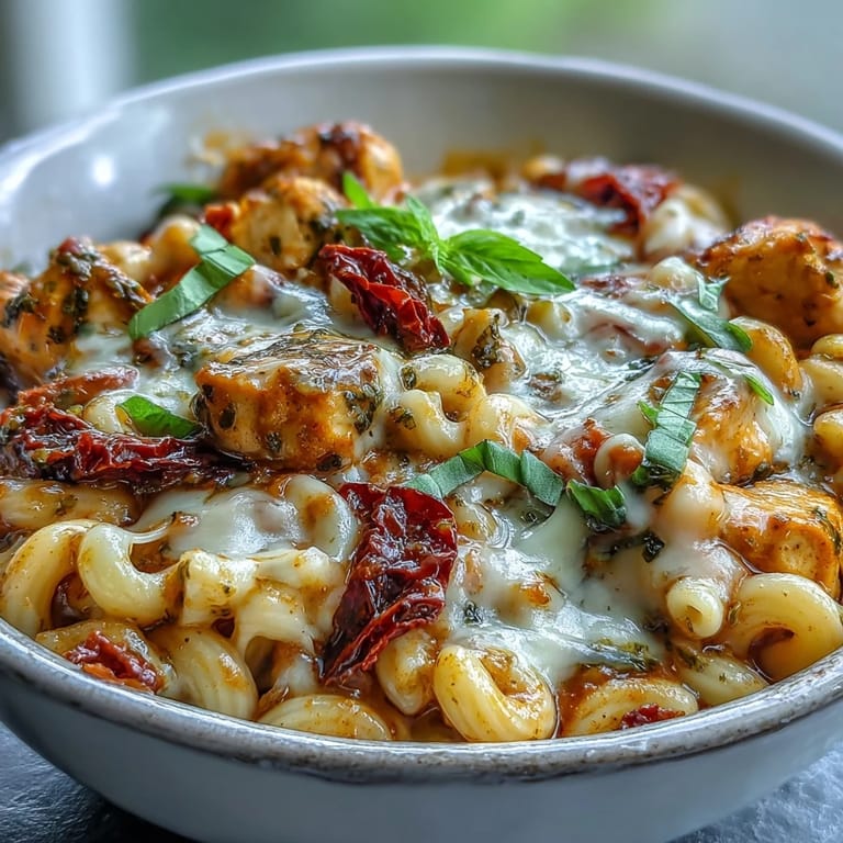 This isn't traditional chili mac, and that's precisely the point. Instead of heavy tomato sauce and spice, you get the garden-fresh brightness of pesto woven through creamy cheese and tender chicken, which feels like Italian comfort food had a conversation with American home cooking and decided to combine forces. The sun-dried tomatoes add concentrated sweetness and depth that canned tomatoes alone could never deliver, creating layers of flavor that surprise you with each spoonful.