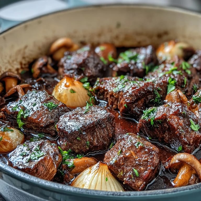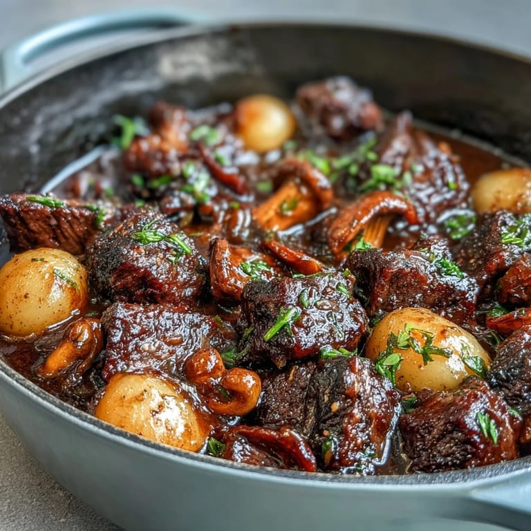 Save to Pinterest There's a particular kind of quiet that fills the kitchen when you're building something slow and intentional, and that's what drew me to this wild mushroom beef bourguignon. I was flipping through an old cookbook one rainy afternoon, looking for something that felt both comforting and a little bit grand, when this recipe caught my eye. The combination of earthy mushrooms, tender beef, and that deep wine-dark sauce seemed to promise something worth the three hours of attention it would demand. I'd made simpler braises before, but this one felt different somehow, like the kind of dish that transforms an ordinary evening into something memorable.
